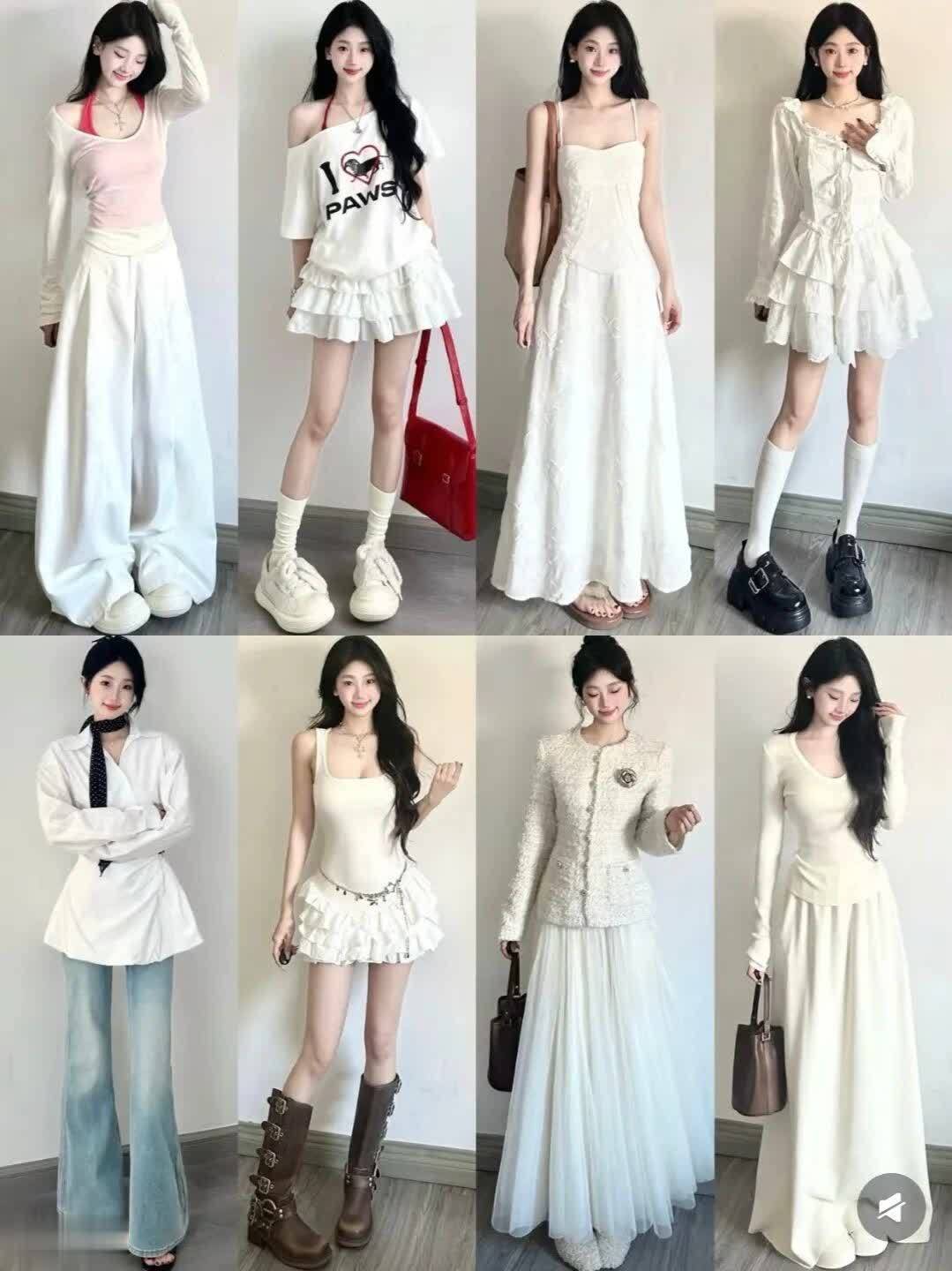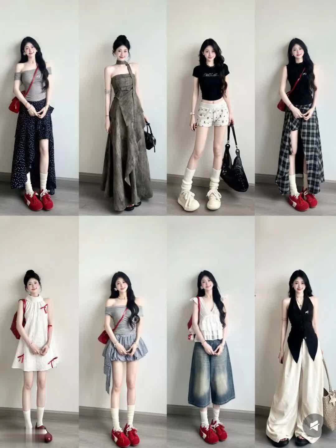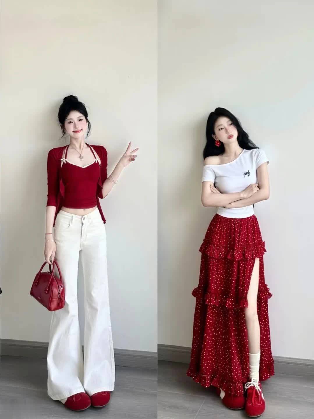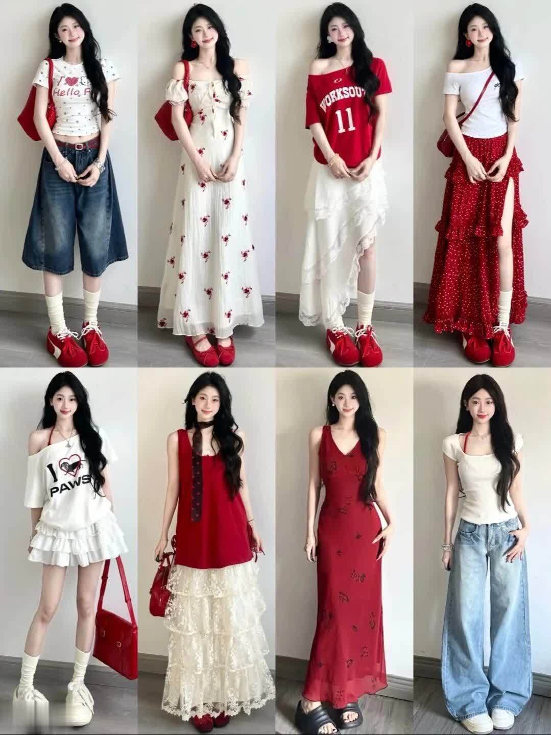 1. 红+白:永远不会出错的经典组合!白T+红裙、红上衣+白裙,清爽又亮眼,减龄又显白,学生党、上班族都能穿!