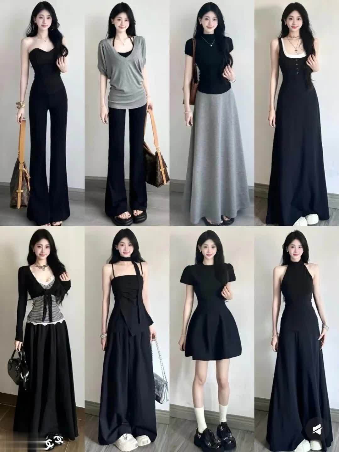 2. 黑+灰/白:经典永不过时!黑上衣+灰半身裙、黑吊带+白内搭,高级感拉满,不挑身材!