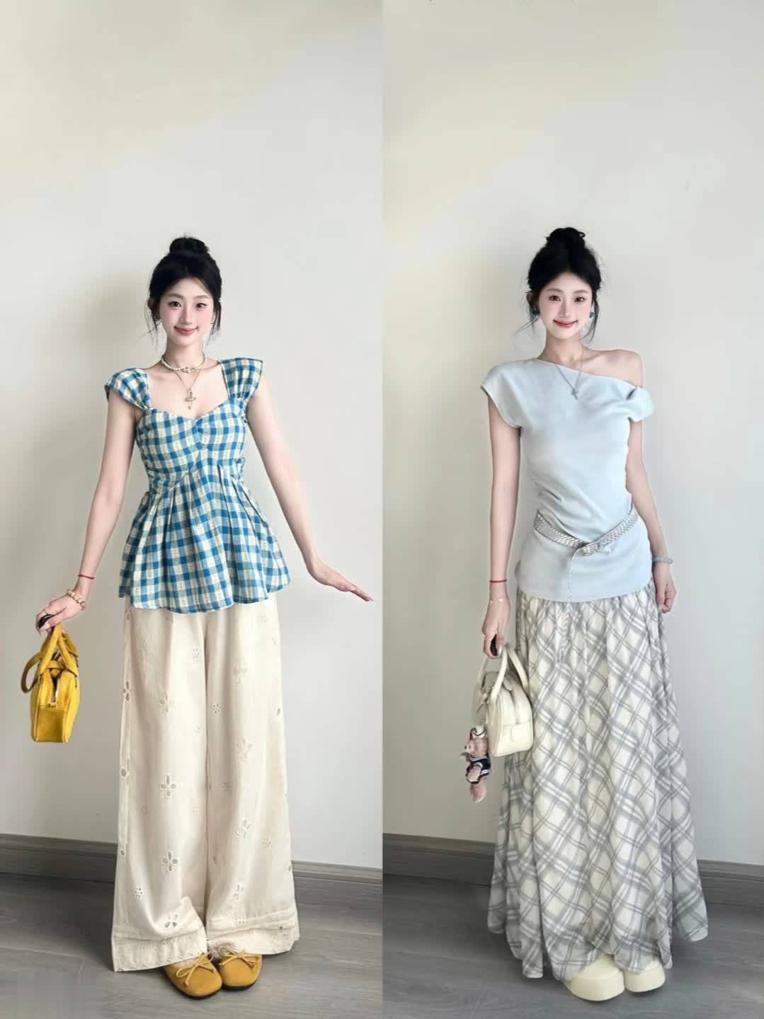 1. 同色系渐变:浅蓝上衣+浅蓝阔腿裤/半身裙,一身蓝清爽又高级,视觉上直接斤!